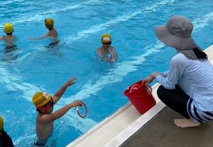 子どもたちが、水中で見つけた「宝」を先生が持つ箱に入れています。
