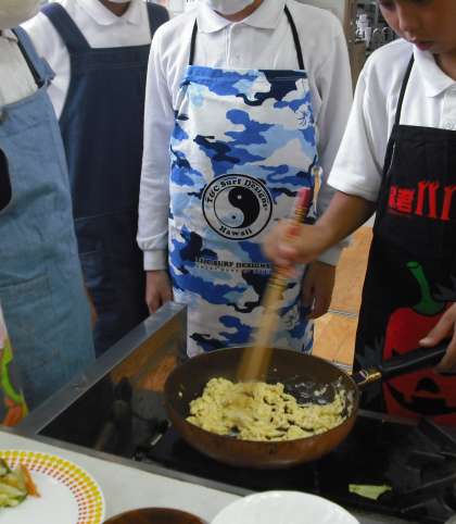 調理実習を行いました。三色野菜の炒め物とスクランブルエッグ。みんなで協力して作りました。