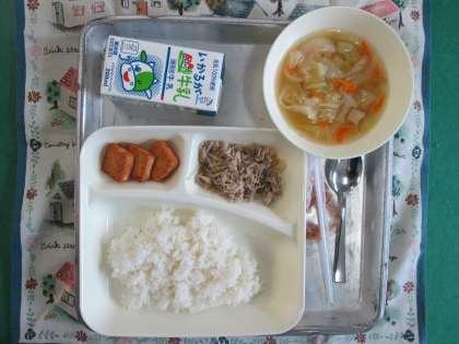 豚肉ともやしのいためもの、すまし汁、あつあげのしょうがじょうゆかけ、ごはん、牛乳