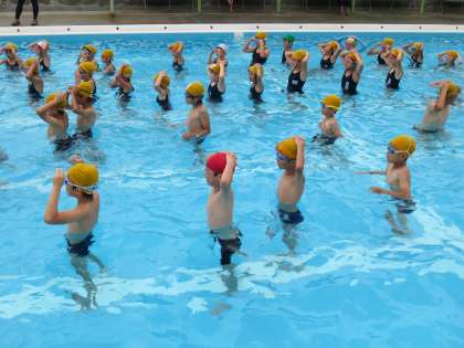 水になれるための動きを、楽々とやっています。水中へ体をしずめることも楽々とやっていました。