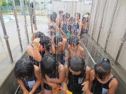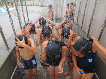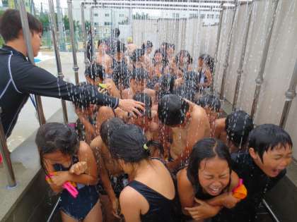 シャワーをはやくすませたいのか・・・逃げようとする子もいます。何年生でもシャワーをあびている顔はとても楽しそうです。
