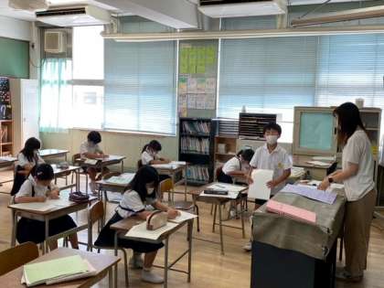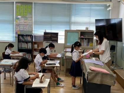 一人一人が、担任の先生に 1学期頑張ったことを褒めてもらい、通知表を受け取っていました。