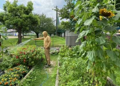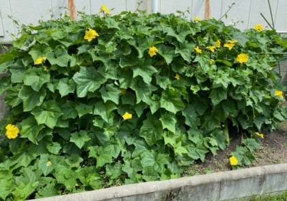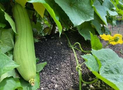 「へちま」の花壇では、緑色の葉のところどころに黄色い花が見られます。