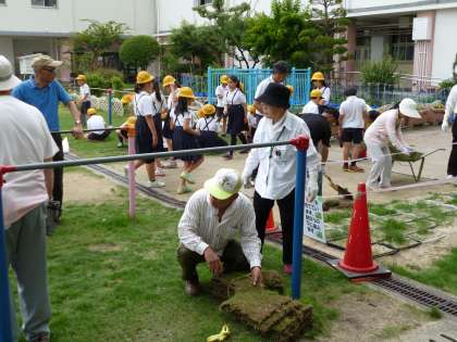 6/24(水)の5時間目に芝生の補植作業をしました。地域の緑化実行委員会の方々や保護者の方にご協力いただき、