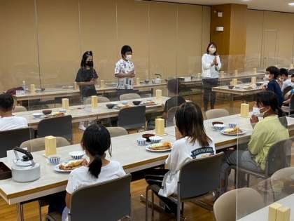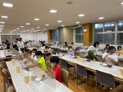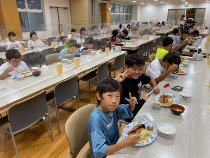 夕食です。感染防止対策のため、みんな前を向いて食べます。食事係の人がみんなの前に立って、「いただきます!!」