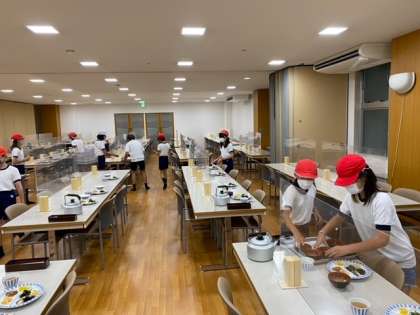 朝の会が終わったら、食事係さんはすぐに食堂へ…一足早くみんなの朝食の準備をします。
