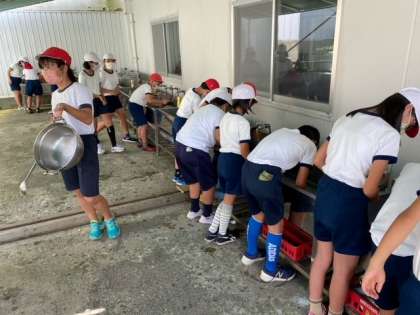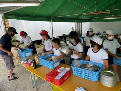食べ終わったら、早速片付けに取り掛かります。これがまた大変な作業…お鍋についてススをがんばって落とします。次に林間学習に来た人が気持ちよく使えるように頑張って合格をもらいましょう!!