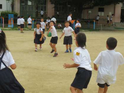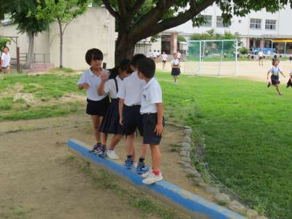 平均台で遊ぶ2年生とドッジボールで遊ぶ1年生です。