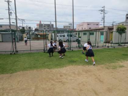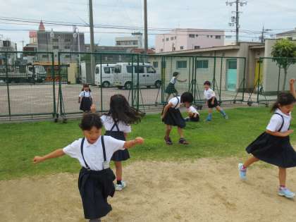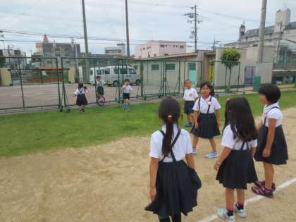 芝生のうえで遊んでいます。「ねずみの足あと123」という遊びらしいです。
