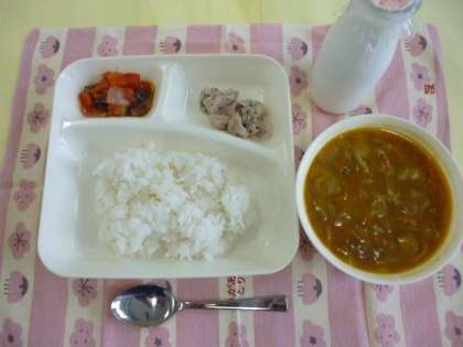 鶏肉のバジル焼き、カレースープ、夏野菜とベーコンのソテー、ご飯、牛乳