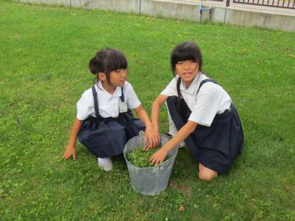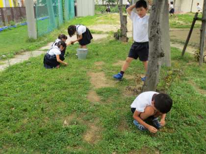 芝生にとってクローバーは雑草になります。とてもつよく、芝生におおいかぶさり広がってきています。子どもたちにお話をしたところ、友だちと協力してクローバーを抜き取り、たくさんバケツに集めていました。6/30