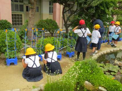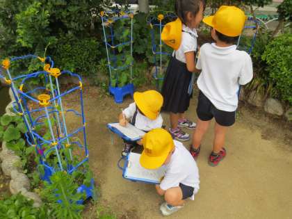 花のつぼみを見つけ、いつ咲くのかと、どの子もとても楽しみにしながら「みつけたよ」カードにかいていました。また、つるののび方や葉っぱのかたちもしっかりと観察しています。