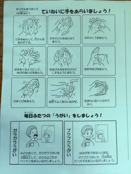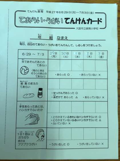月曜日の児童朝会で保健委員の児童が、手洗い・うがい点検週間6/29(月)〜7/3(金)の連絡をしました。一人一人の児童は、毎日、自分の手洗い・うがいはきちんとできているかを「てんけんカード」にチェックしています。