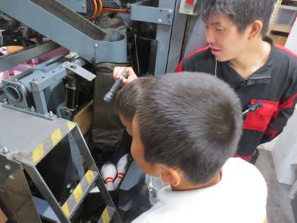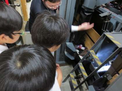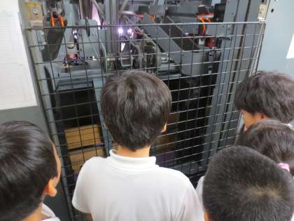 グループごとに裏側の機械を見学しました。ボーリングのピンが機械で取り込まれもとに戻る素早さに、子どもたちは、そのすごさに驚いていました。