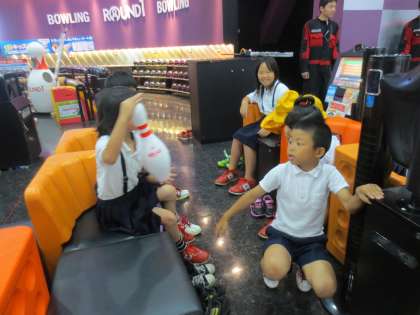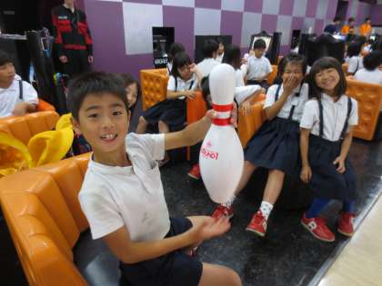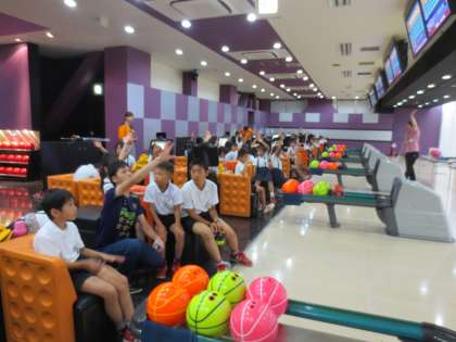 ボーリングのピンに実際にふれ、その大きさを体感しました。そして、ルールやマナーを守ることの大切さを、子どもたちに分かりやすく教えてもらいました。どの子も真剣に聞いていました。
