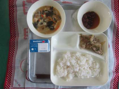 豚肉の甘辛焼き、みそ汁、金時豆の煮もの、ご飯、牛乳