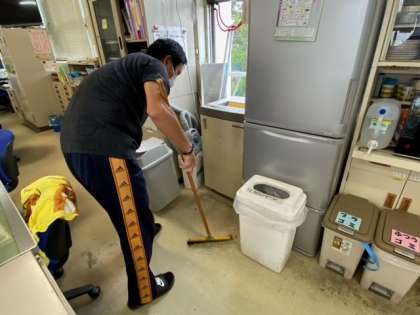 職員室では教頭先生が掃除をしています。