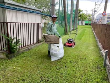草刈りの終わった管理作業員さんは笑顔です。
