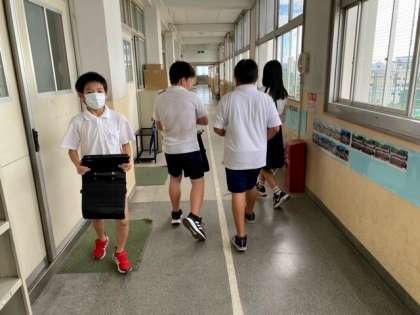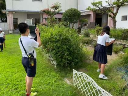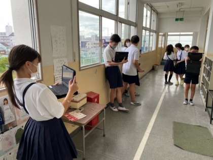 「思い出の場所をえがこう」のテーマで、子どもたちが、タブレット端末を手に、好きな(思い出に残る)場所の写真を撮りに行っています。