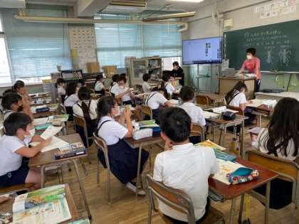 2組の理科は、「昆虫の成虫の体のつくり」について大型テレビの映像を見ながら学習していました。