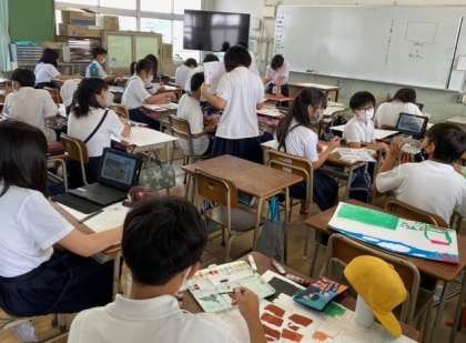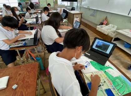 前の時間にタブレット端末で撮影した、好きな(思い出に残る)場所の写真を、画用紙に描いて、絵の具で色を塗っています。