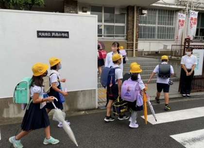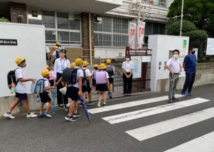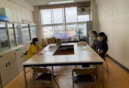朝の登校指導と1限の事務室での研修のようすです。