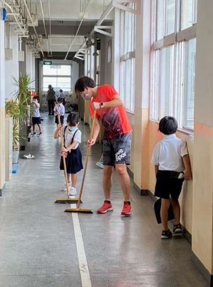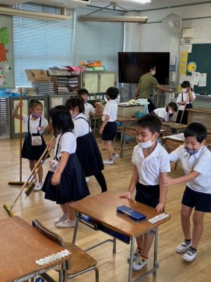 子どもたちが、ほうきで一生懸命に掃き掃除をしています。 微笑ましい光景です。