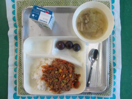 野菜たっぷりカラフルライス、キャベツときのこのスープ、ぶどう(巨峰)、ご飯、牛乳