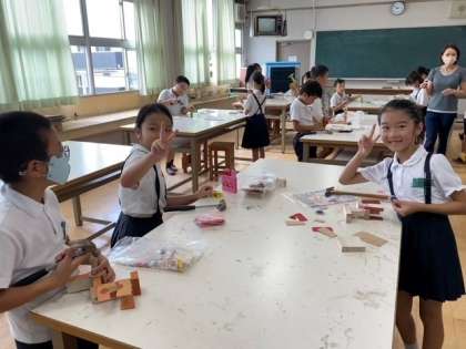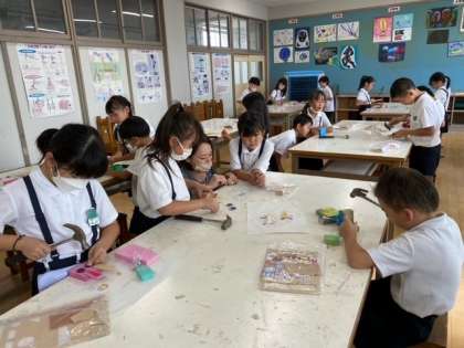 「くぎうちトントン」の教材を使った作品づくりの続きで、初めて「かなづち」を使いました。