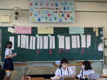 正面に「ルールを守りみんなに優しく全員仲良くするクラス」 の学級目標が掲げられています。