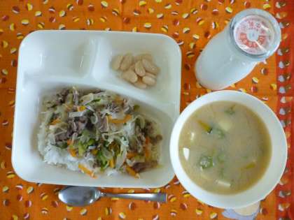 牛丼、みそ汁、大福豆の煮もの、ご飯、牛乳