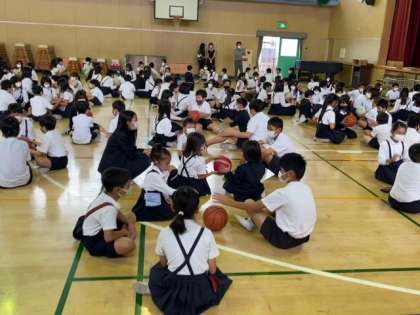 集会委員会の児童が、ドン(ストップ)といったところで、ボールを持っていた人が自己紹介として自分の好きなことなどをしゃべります。