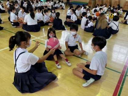 縦割り班で円になって座り、一つのボールを隣へ隣へと回します。