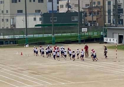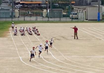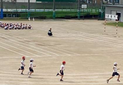 入場門からスタート位置まで移動し、先生のスタートの合図で、実際にトラックを力いっぱい走りました。