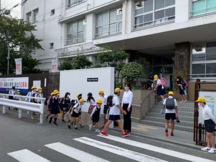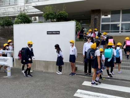 正門で、児童会の子どもたちが、集団登校してくる子どもたちと、元気にあいさつを交わしています。