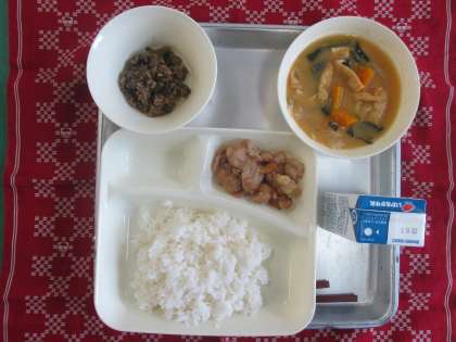 鶏肉のてり焼き、みそ汁、なすのそぼろいため、ご飯、牛乳