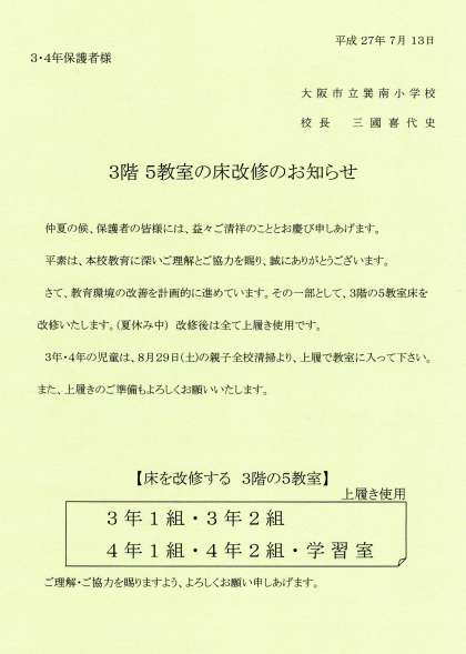 教育環境の改善を計画的に進めています。その一部として、3階の5教室床を改修いたします。(夏休み中) 改修後は全て上履き使用です。3年・4年の児童は、8月29日(土)の親子全校清掃より、上履で教室に入って下さい。また、上履きのご準備もよろしくお願いいたします。