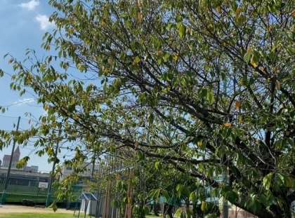 運動場の桜の木を見ると、ところどころ黄色に色づいた葉が見られました。