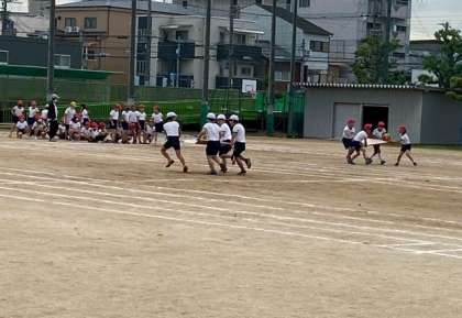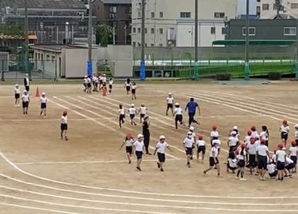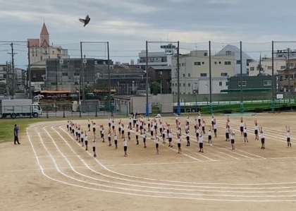 ラジオ体操のあと、団体競技の練習を、入場から競技、退場まで通して行いました。