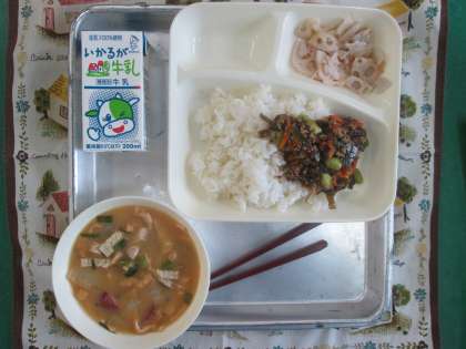 もずくと豚ひき肉のジューシー、さつまいものみそ汁、焼きれんこん、ご飯、牛乳