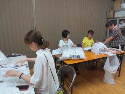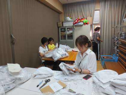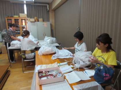PTA給食委員会の方々が、1学期に使った「給食エプロン」の修理をしています。ほころびや破れなど12学級分の修理をしていただきました。ありかとうございます。