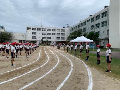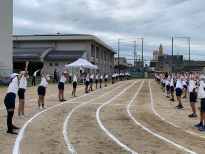 運動委員会の児童が前に出て体操をしています。このあと競技が始まります。