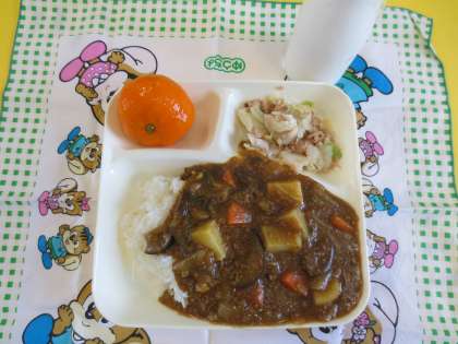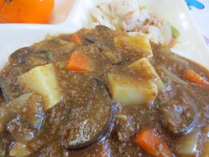 牛挽肉と夏野菜のカレーライス、ツナとキャベツののマヨネーズいため、みかん(冷)、牛乳