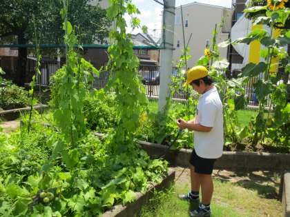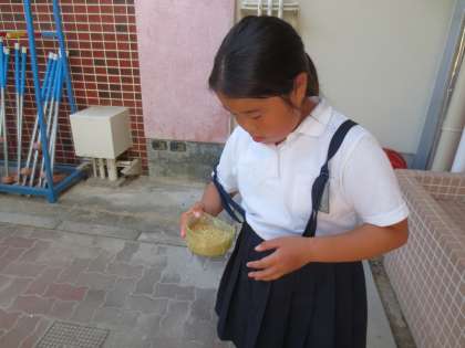 飼育委員会の児童たちが当番で、毎日、チャボたちの世話をしています。また、学習園の水やりなども暑い中、一生懸命にしてくれています。
