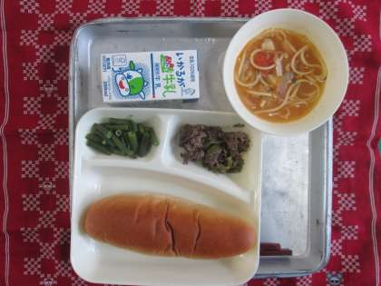 牛肉の香味焼き、ほたて貝とトマトのスープスパゲッティ、さんどまめのサラダ、黒糖パン、牛乳