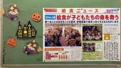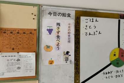給食室横に掲示されている作品には、季節に合ったかわいい絵が描かれていました。
