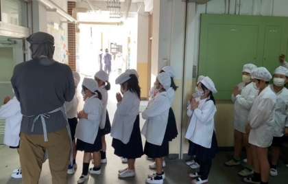 (2年生の当番児童が、給食を受け取りに来ていました)