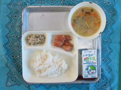 鶏肉のチリソース焼き、焼き豚とワンタンの皮のスープ、切り干しだいこんのごま辛みづけ、ごはん、牛乳