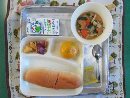 豚肉といかの中華煮、大学いも、みかん、コッペパン、アプリコットジャム、牛乳