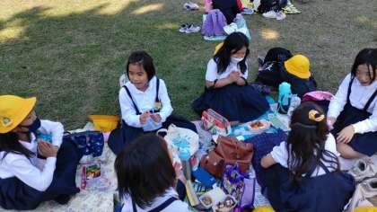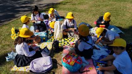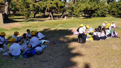 外で、友だちや先生と一緒に食べるお弁当の味は格別です……